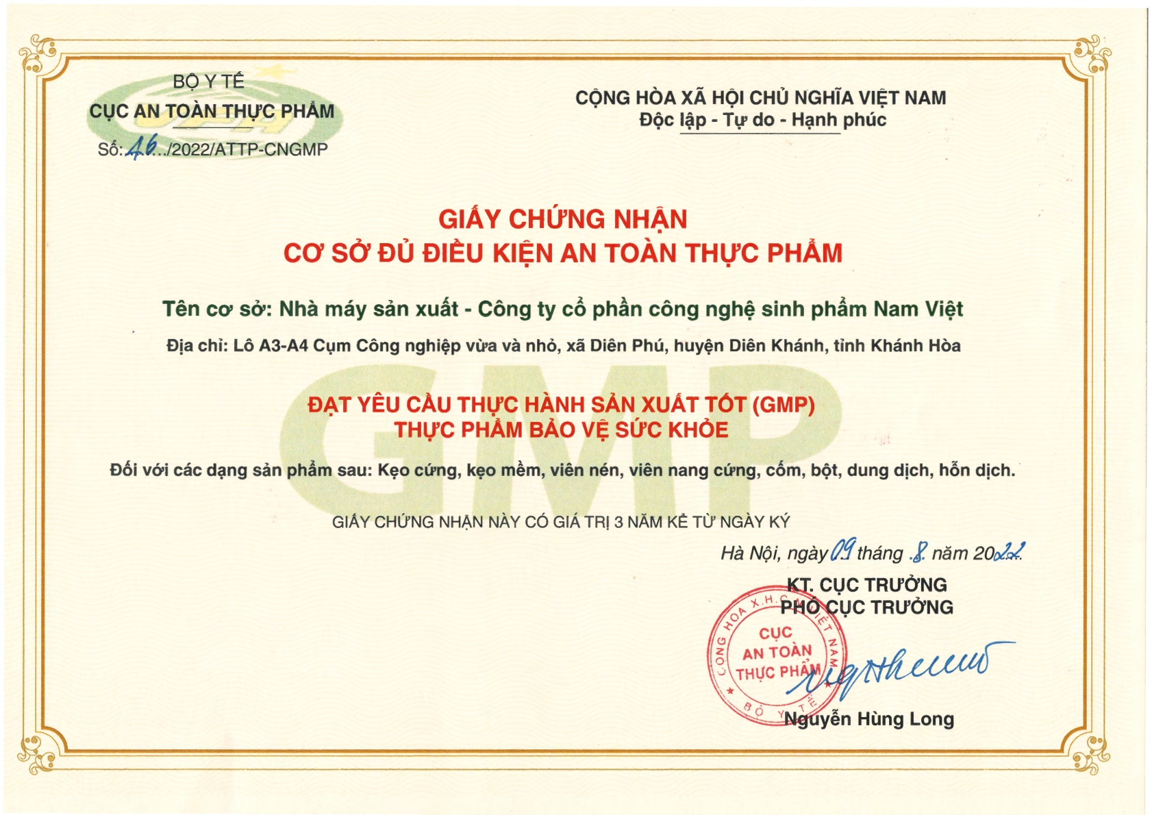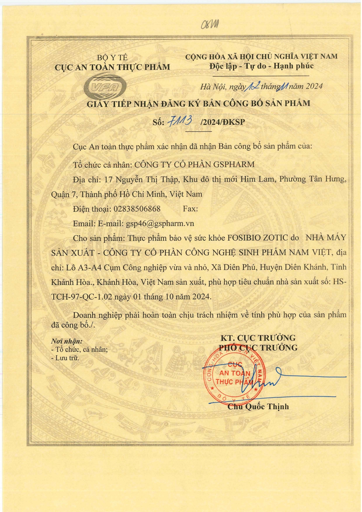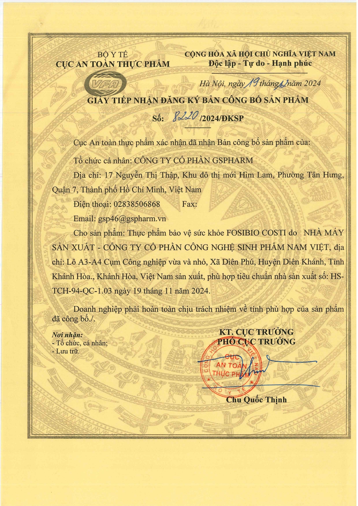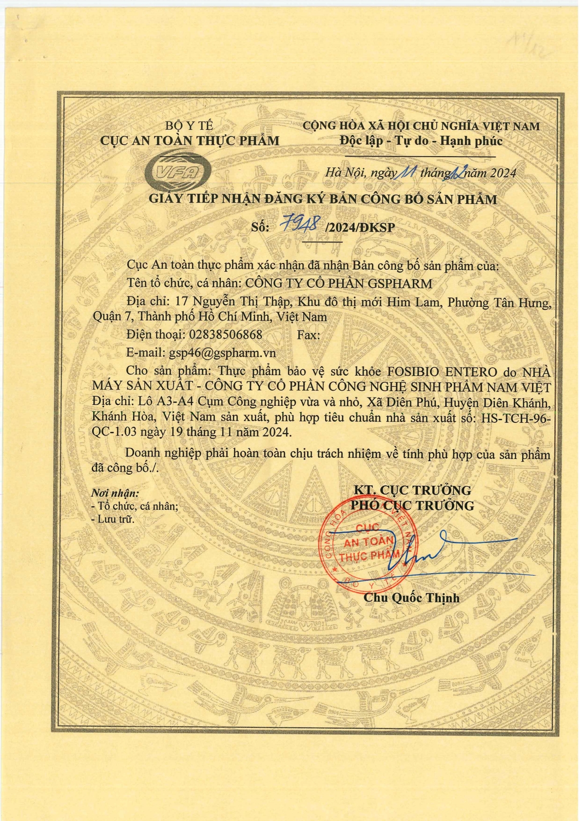 - Bào tử lợi khuẩn Bacillus subtilis: 1 x 10^9 CFU